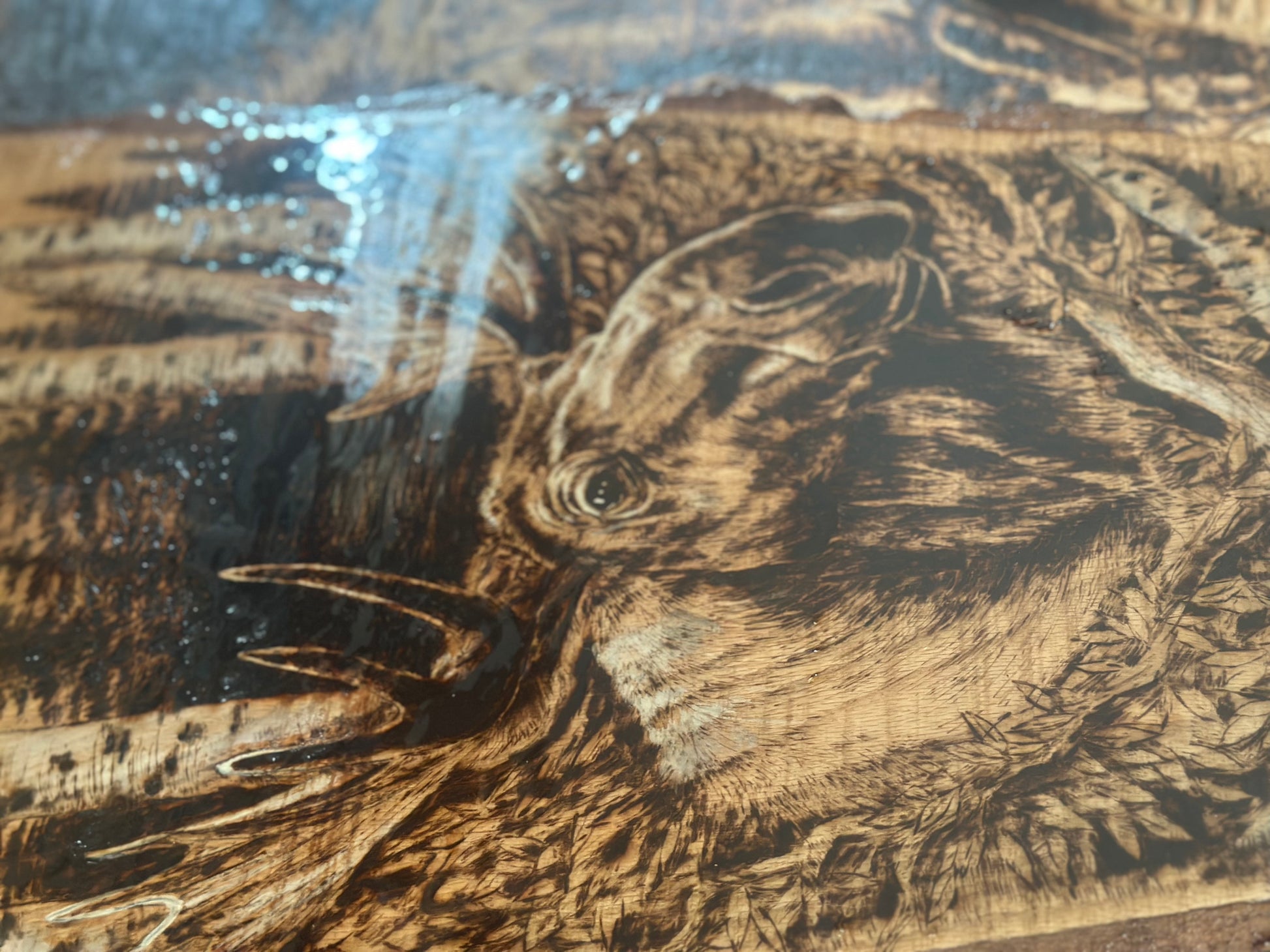 - Medium: Hand-burned pyrography on natural wood slab
