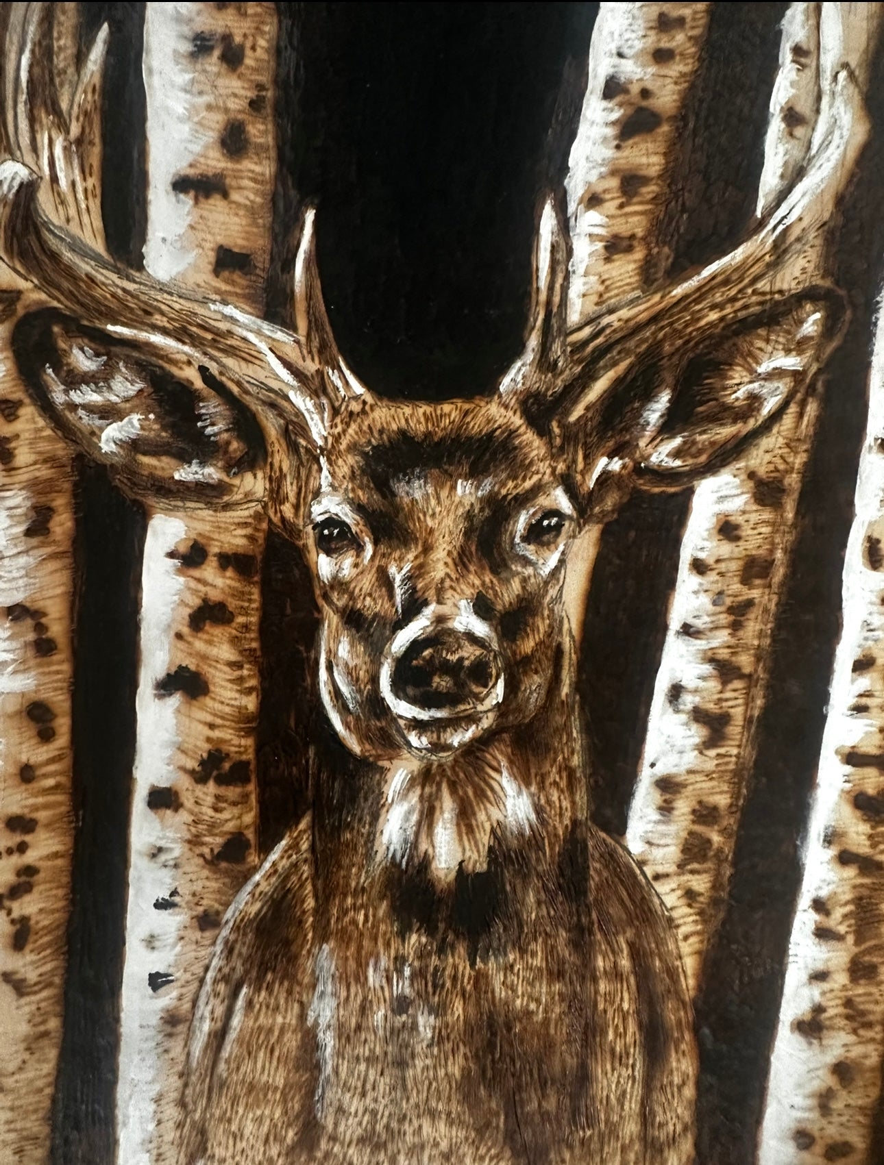 “Among the Birches” captures a solitary deer standing watch beneath slender birch trunks — a moment of grace and quiet strength preserved in wood and flame.